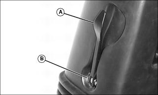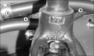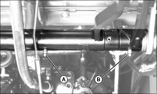 2. Locate brake pedal linkage grease fittings (A and B) under the front left of the operator's platform.