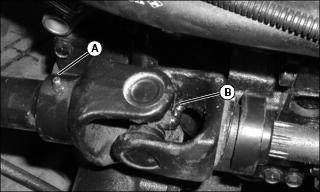 3. Pump grease into grease fitting (B) until it can be seen seeping from all four bearing caps on the inside of universal joint.