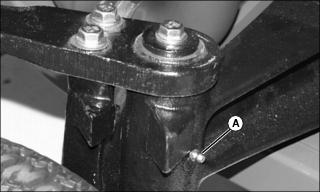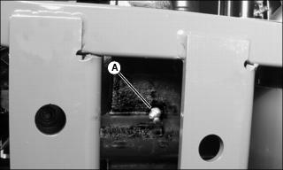 2. Locate rear axle pivot pin grease fitting (A) under rear of machine between frame members on bottom of rear axle.