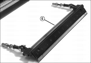 9. Tap both ends of bed knife (E) with a brass hammer to remove any play in bed knife support. Tighten bolts to 63 N·m (46 lb-ft).