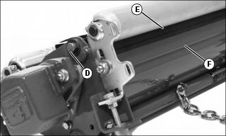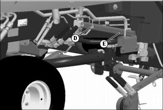 6. Remove pins (D) from rear reel stabilizers (E) and slide stabilizers off the machine