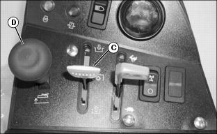 7. Push forward on the mow-transport lever (C) to engage. Push the lift-lower lever (D) forward to lower position.