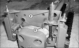 11. Adjust reel-to-bed knife clearance by loosening jam nut (E) and turning adjusting nut (F) and jam nut (E) to proper clearance on both ends. Check for uniform clearance across entire bed knife. If clearance is not uniform, repeat steps 5 through 9 until clearance is uniform across entire bed knife.
