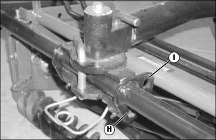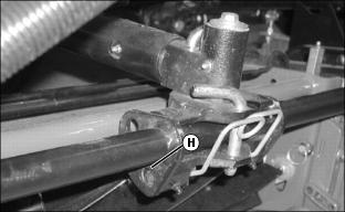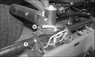4. Shut off the engine and put the spring levers back up on each cutting unit. Jiggle them to make sure the pins lock in place (H).