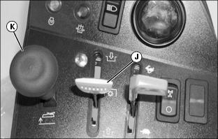 10. move the mow-transport lever (J) to the mow position and pull back the mow-lift lever (K) to raise the cutting units.