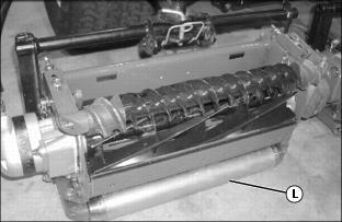 16. Lower the cutting units so the back roller (L) is on the floor. This stabilizes the cutting units and takes the load off the lock pins. The cutting units are now ready for servicing.