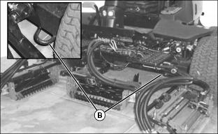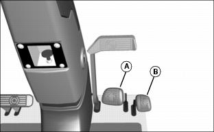 4. To travel in reverse, slowly push reverse pedal (B) down. The farther the pedal is pushed down the faster the mower will travel.