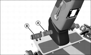 2. Push the mow-transport lever (B) forward to the mow position (forward until lever stops).