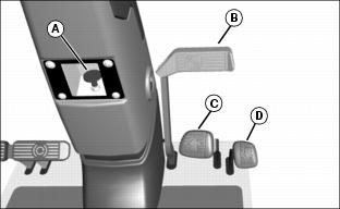 3. To travel forward, slowly push hydrostatic control forward pedal (A) down. The farther the pedal is pushed down, the faster the mower will travel.
