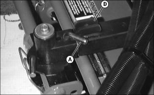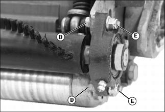 4. Loosen two bolts (D) and locknuts (E) on right side of cutting unit.