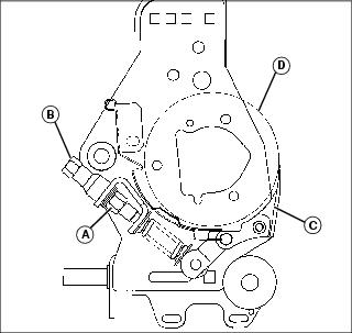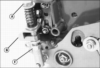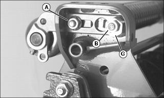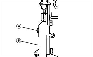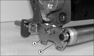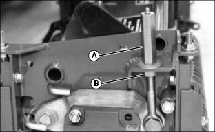 7. Tighten both pivot bracket locknuts (B) and the idler gear pivot locknut (A).