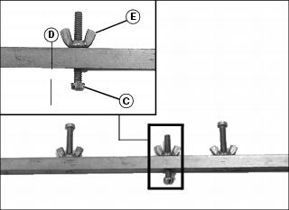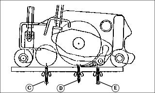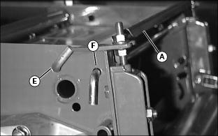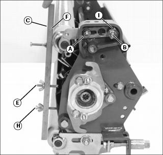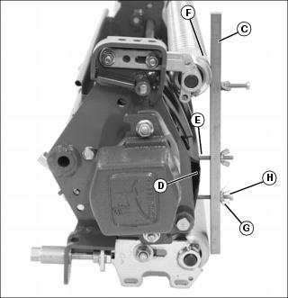 6. Tighten bolts (C) on left side of cutting unit and bolts (D) and locknuts (E) on right side of cutting unit.