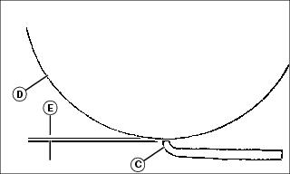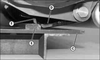 · Turn each tower adjuster (E) until leading edge of vertical cutting blade aligns with the cutting depth mark on the gauge bar.