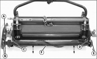 5. Adjust the front roller height to bring the leading edge (B) of the cutting blade in line with the mark on the gauge bar. Rotate reel back and forth to ensure blade tip does not extend beyond depth mark.