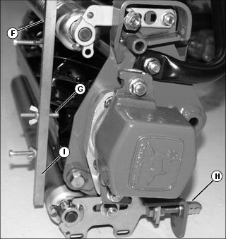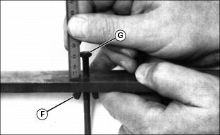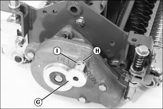 4. Rotate eccentric adjuster (G) until the front roller (H) sits flat and parallel with the bench plate. Gap (I) should not exceed 0.050 mm (0.002 in.) maximum.