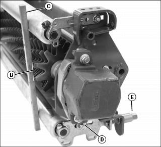 5. With the use of a feeler gauge, alternately turn adjusters (B) no more than one flat at a time until bed knife to reel clearance (E) measures 0.025 mm to 0.050 mm (0.001 in. to 0.002 in.).