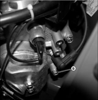 4. Disconnect fuel hose (A) from the outlet side of the fuel filter (B), and drain gasoline into a properly marked container.
