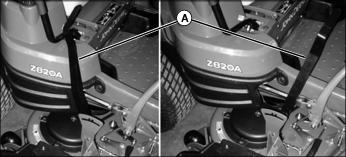 2. Push button (A) on left motion control lever to raise mower deck.
