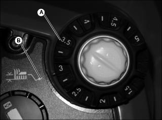 5. With deck in raised position, adjust height of cut knob (A) to align cut height to index mark (B).