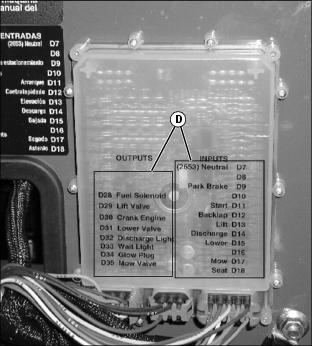 7. If starter does not engage, use the module display lights (D) and diagnostic codes to diagnose the problem. The module display lights will illuminate as each function switch is actuated.