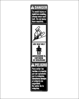 • To avoid injury from crushing, always wear seat belt. Do not jump from machine.