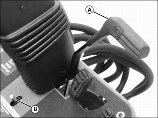 • Hydraulic Oil Temperature Indicator (B) will glow when hydraulic oil temperature is high. Stop all hydraulic functions immediately. Let hydraulic oil temperature cool by allowing engine to idle under a no-load situation. This keeps the oil flowing through the oil cooler and cools the oil. Check oil level and make sure oil cooler coils are clean. Continued operation may cause higher temperatures, resulting in damage.