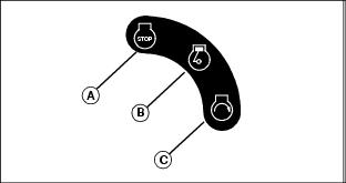 • Start position (C) - starter should engage and crank the engine. After engine starts release the key to the run position. All indicator lights should go out.