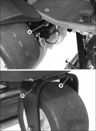 • Attach the tie downs to slots (A) provided on both sides of the operator's station in the main frame and slots (B) on both sides of the rear wheel yoke.