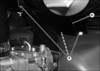 5. Remove the three hex head bolts (F) and air cleaner bracket (G).