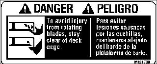 To avoid injury from rotating blades and thrown objects, stay clear of deck edge and keep others away.