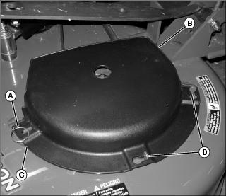 • Lift corner of belt shield from stud (C). Rotate shield counterclockwise to clear head pins (D).