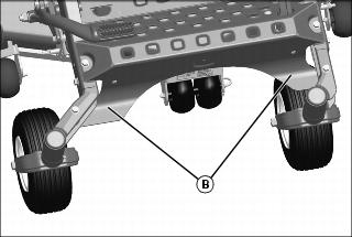 4. Safely lift front of machine at bottom of plates (B). Place jack stands or other stable supports near lift locations.