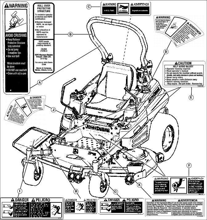 To avoid injury from rotating blades and thrown objects, stay clear of deck edge and keep others away.