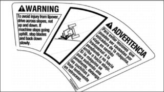 • To avoid injury from tipover, drive across slopes, not up and down. If machine stops going uphill, stop blades and back down slowly.