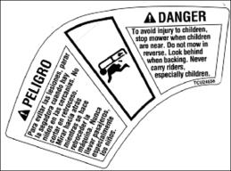 • To avoid injury to children, stop mower when children are near. Do not mow in reverse. Look behind when backing. Never carry riders, especially children.