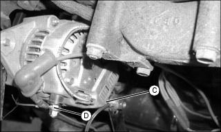 7. Route the red and brown wires following the same routing as the main machine wiring harness. Connect the brown wire ring terminal to ground (C) as shown. Connect Red wire to alternator terminal (D) as shown and install boot on terminal