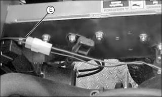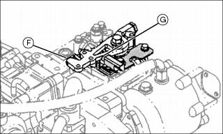 4. Verify that the button (G) on switch is engaged by the reverse arm (F) when the reverse pedal is depressed. Adjust the position of the switch by moving hardware in hole (D).
