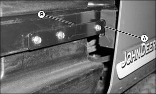 1. Line up slides (A) on inside of engine cover with rails (B) on left and right side of machine.