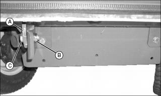 3. Attach MCS to rear of machine at the rear by aligning holes in MCS frame (A) with holes in rear brackets and securing with bolts (C) and nuts (B).