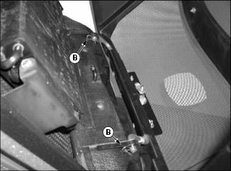 4. Fasten boot (B) to mower deck with long pin and quick connect pin.
