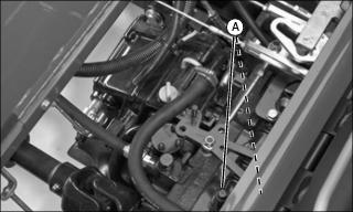 1. Remove nut and screw from hole (A) on the right side of the engine compartment.