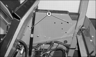 • Remove two spring pins (B) and lower hood to ground with cable still attached.