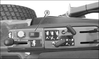 3. Route the purple, pink, gray and white wires for the MCS rocker switch (B) up under the operator’s console and install the MCS switch with the red button towards the front of the machine as shown.