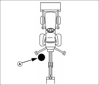 3. While standing at location (A) (between backhoe stabilizer and boom), lower stabilizers to the ground.