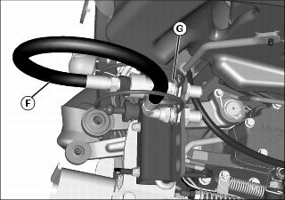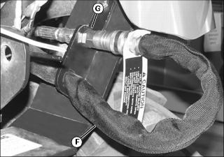 d. Connect long hose (F) on tractor to coupler (G).