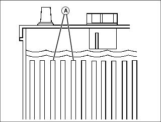 If the electrolyte level is low, add water near the end of the charge cycle or after taking the battery off charge. Never allow the electrolyte level to drop below the tops of the plates (A) because the exposed portion of the plates will become permanently inactive due to sulfation.