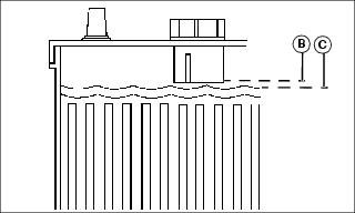 MAXIMUM electrolyte fill level (C) is 3 mm (0.125 in.) below the level indicator.