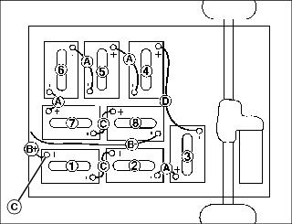 7. Use insulated tools to tighten each battery hold down bolt (C) to 7 - 9 Nm (62 - 80 lb-in.).