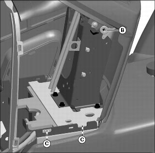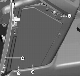 1. Install tabs on bottom of side panel into grooves (C) on machine frame. Install top of side panel tab into rubber grommet (B).