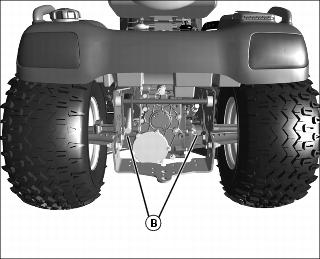 8. Fasten rear of machine at both sides of the axle at points (B) to trailer will heavy-duty straps, chains, or cables. Straps must be directed down and outward from machine.